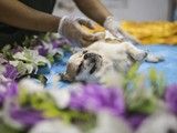 1、宠物殡葬师擦拭宠物体表,将身上污渍、血渍清理干净。
