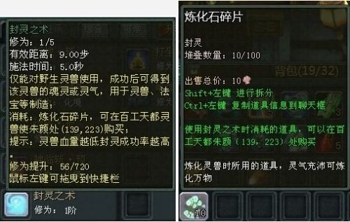 “封灵之术”技能需要由“炼化石碎片”来发动,所以平时请注意常备“炼化石碎片”。封灵之术的修为越高,野生灵兽的血量越小,则封印灵兽的成功几率越大。