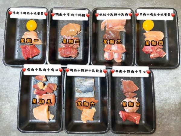 把食材切好,去皮去内脏,脂肪不一定要全部切除,猫咪需要部分脂肪。按照一星期的量分好,每日搭配的肉类不同。如图是100克每天的量,猫咪吃的多的,可以多做些。本配方是生骨肉,在做之前,肉最好冷冻1周以上。对于一直吃猫粮,没有尝试过生骨肉的猫咪,建议逐渐增加生骨肉的量,不要过量,少食多餐。
